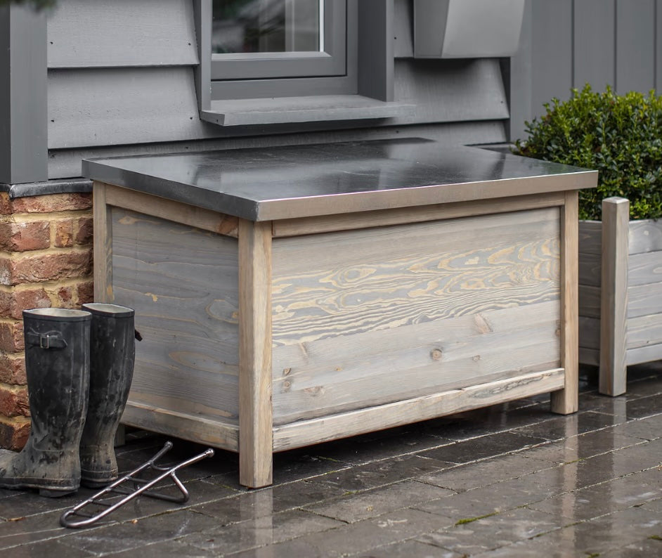 Crafted from spruce with a soft grey wash, our Aldsworth Outdoor Storage Boxes are a practical yet stylish solution for keeping spaces tidy—indoors or out. Each box features a robust, slanted hinged lid made from galvanised sheet metal, offering excellent protection against the elements.