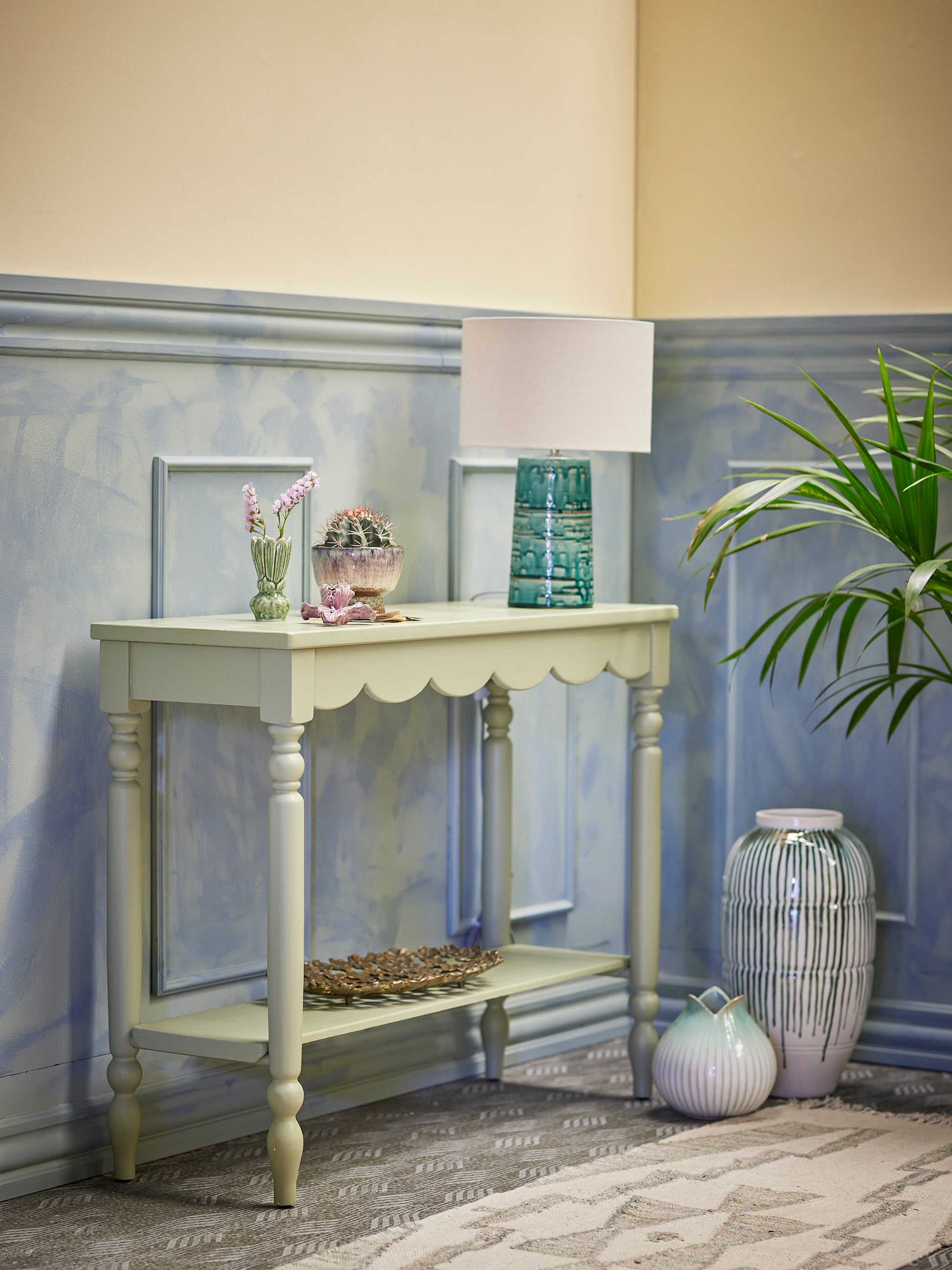 The Salla Console Table by Creative Collection is made of pine and painted in a dusty green color with a subtle patina. The wavy edge of the tabletop and the extra shelf give the table a decorative look and practical functionality.