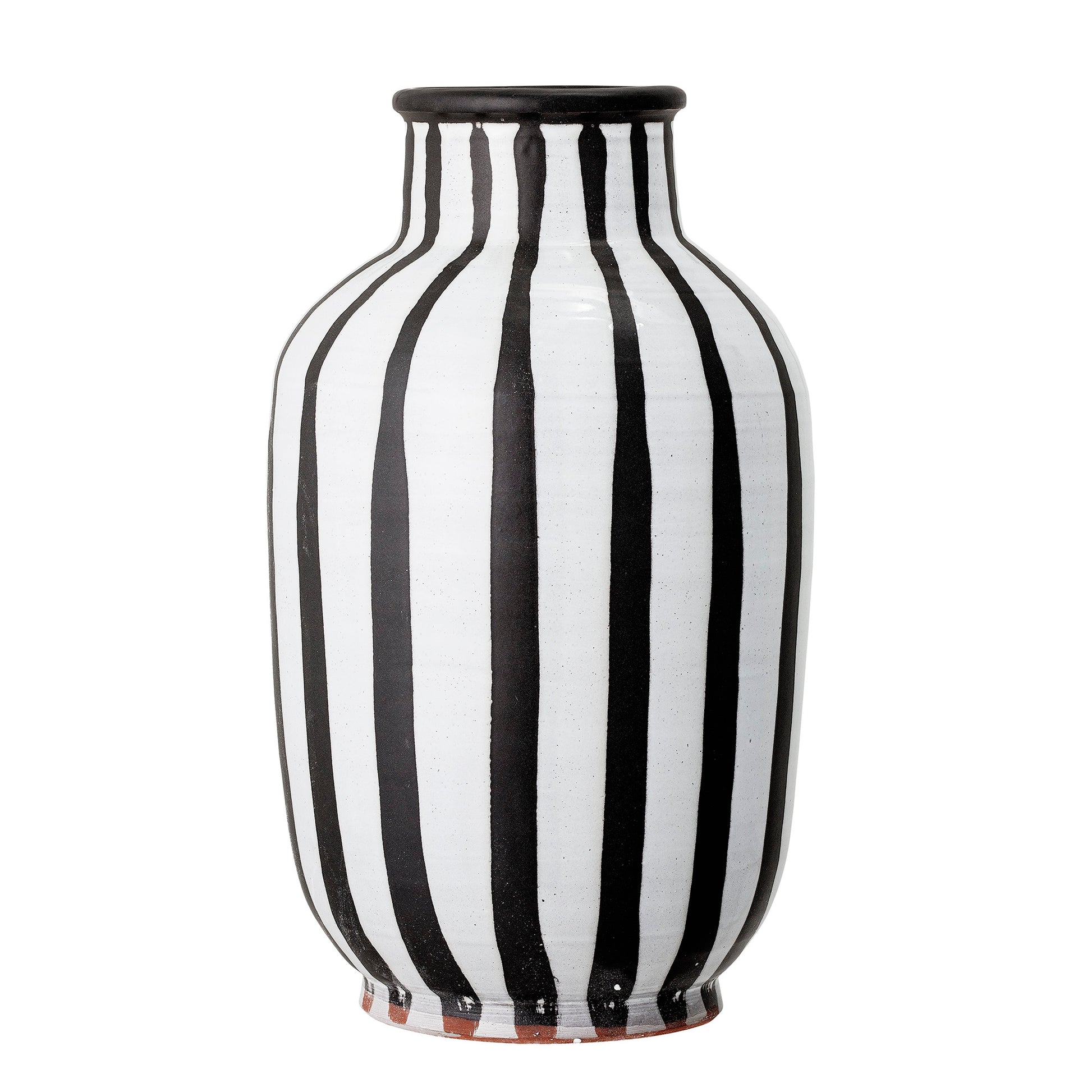 With its 44 cm height, this deco vase is made for the purpose of placing on your floor in order to decorate any corner of your house. The vase is made of terracotta with a black and white stripe pattern. The vases are painted by hand making each and every one of them unique. The vase is not waterproof but perfect for holding dried plants, flowers, sticks or any other piece of nature you want to bring into your home.