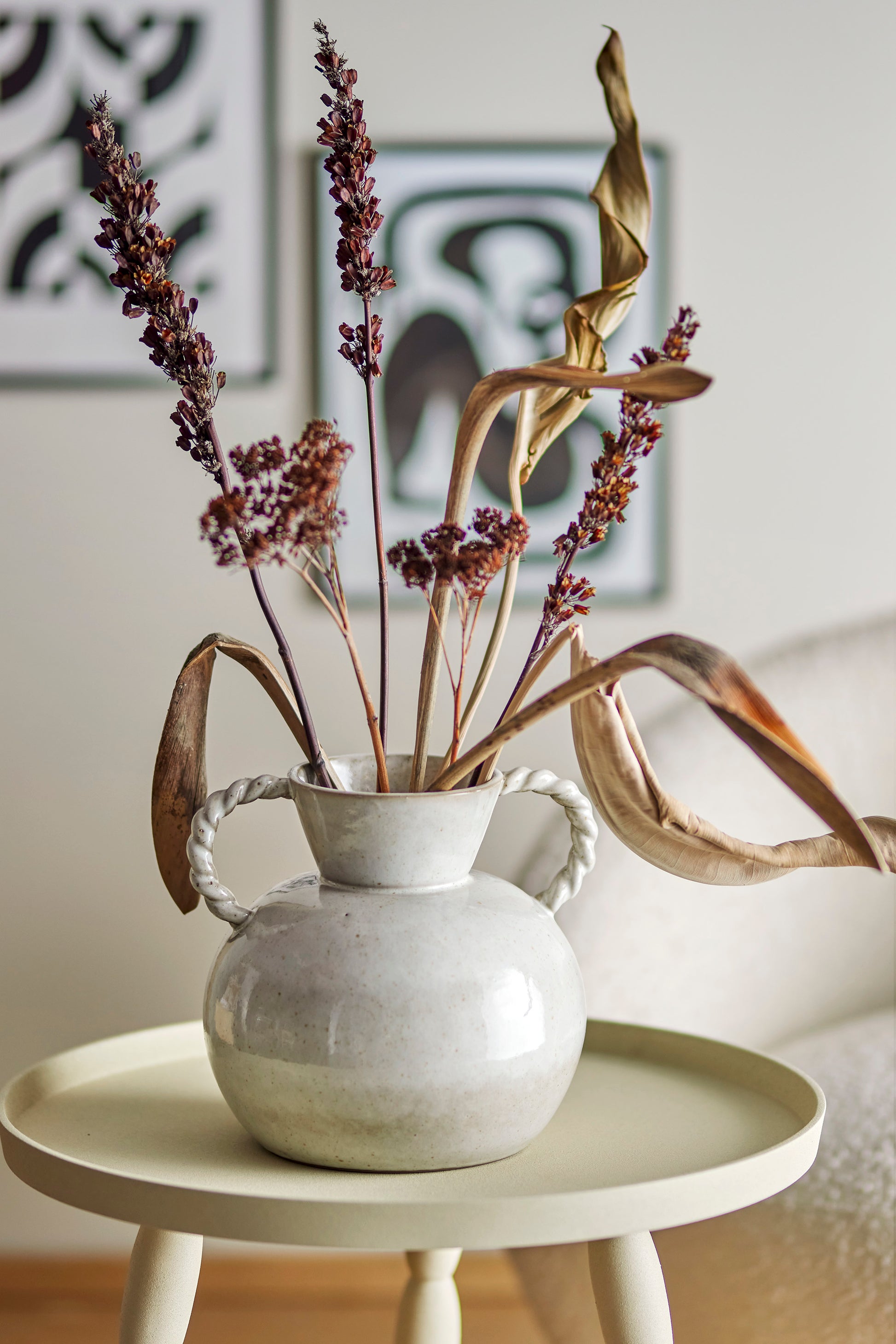 The Semira Vase by Bloomingville has a cool detail with braided handles. The vase is a good size for large bouquets of flowers, but can also be used to advantage without flowers as a decorative object in your home.
