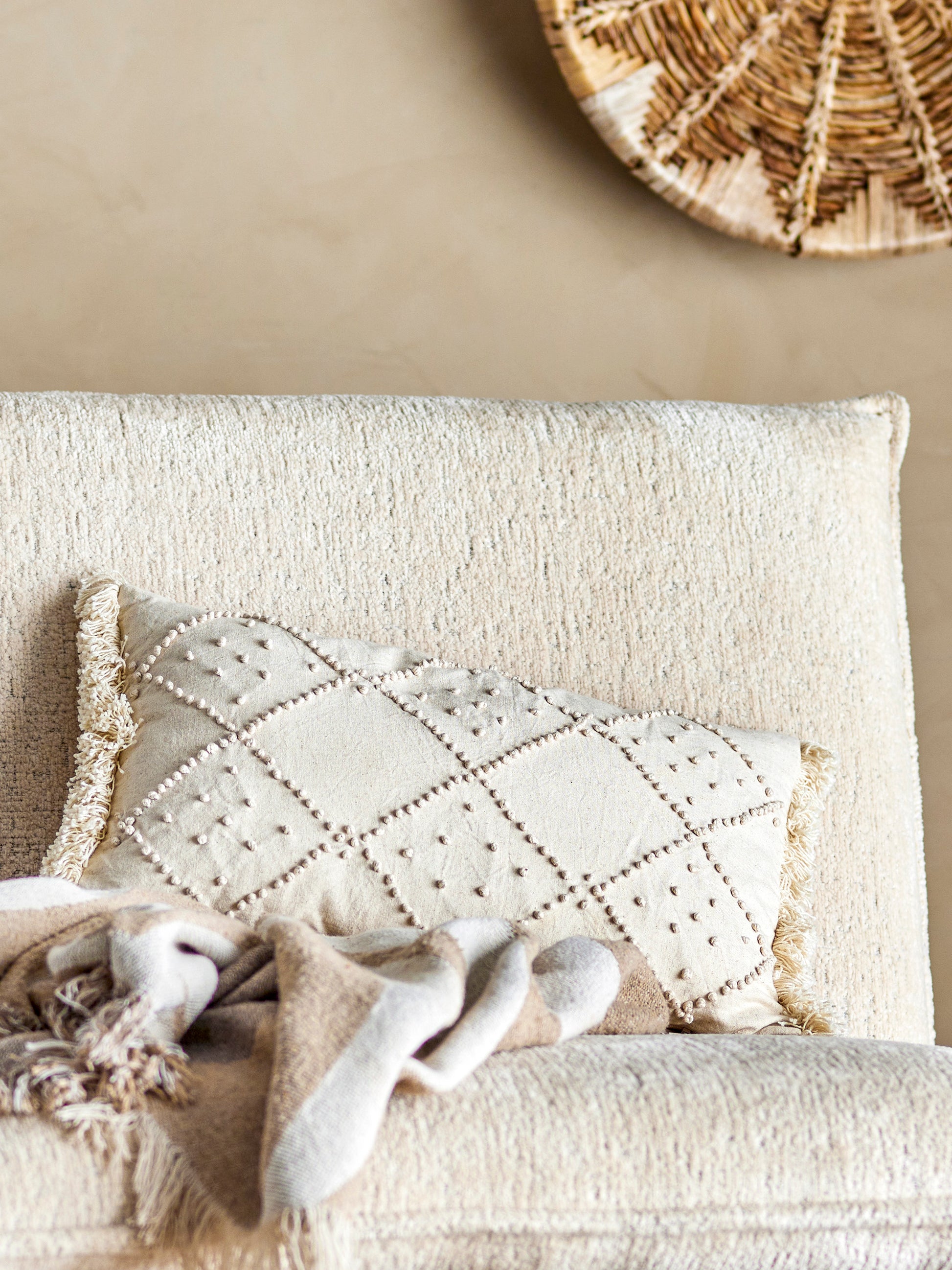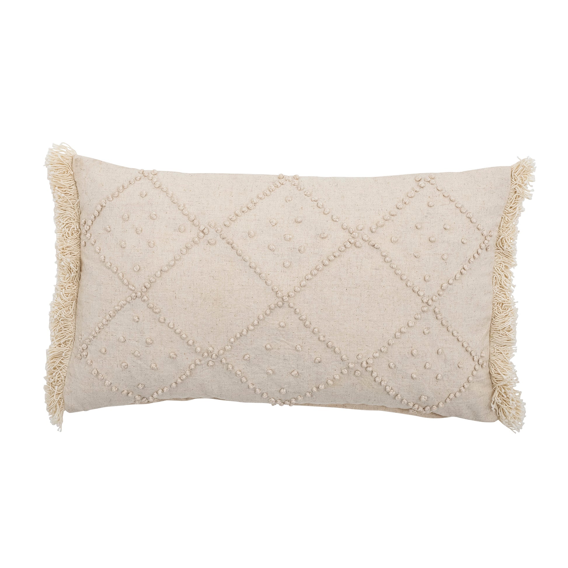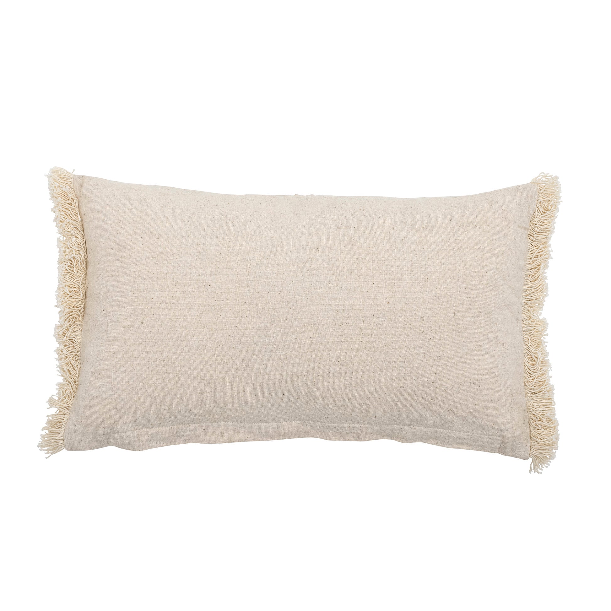 The Truro Cushion by Bloomingville woven in cotton with a decorative embrodied pattern in off-white hues. It has a rectangular shape and a soft tone-on-tone look. The decorative cushin has fringes in each end as a cozy touch.